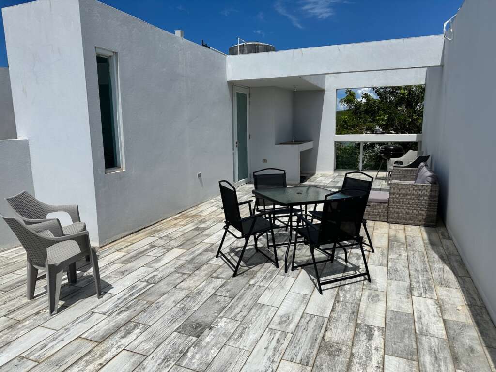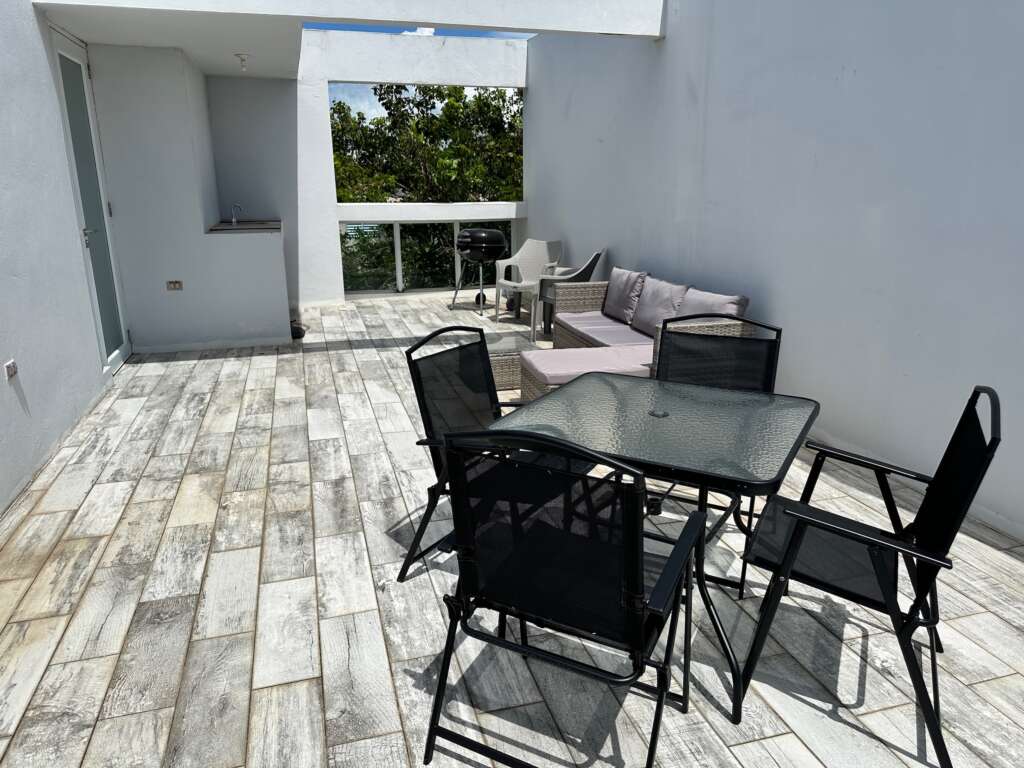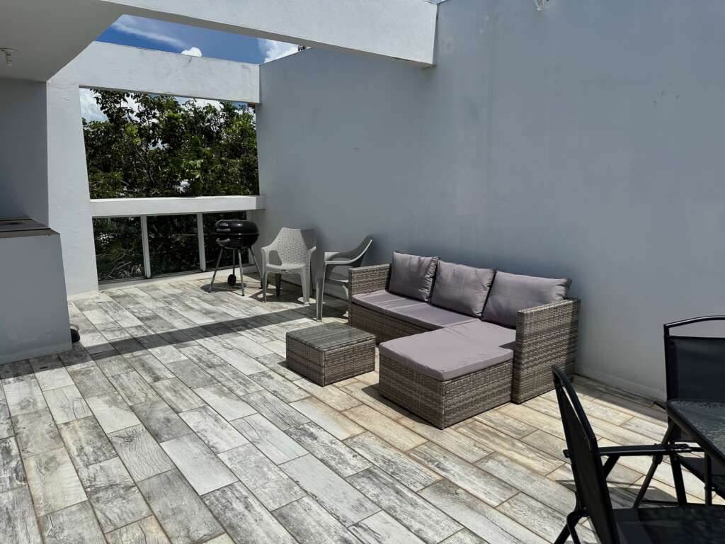 At the main level you will find the kitchen, powder room, dining room and living room. Air conditioner for living area. Rooftop terrace includes a BBQ and patio furniture.