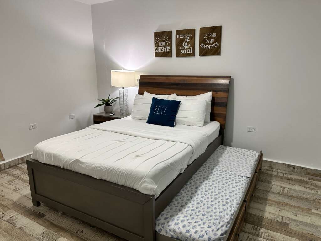 This charming 2 bedroom apartment is just steps from the beach and part of Paradise Beachfront Villa. It has all you look for on a beach vacation home. Adults setting. This fully newly furnished 2 bedroom apartment has everything you’ll need, including beach towels, cooler, fully air conditioned, comfy beds and pillows, 1 bathroom, outdoor tub, grill, living/dining area, smart TV and high speed internet with WiFi. Fully equipped kitchen (cooking utensils included), washer/dryer combo. Kayak, power generator plus solar panels, solar water heater.